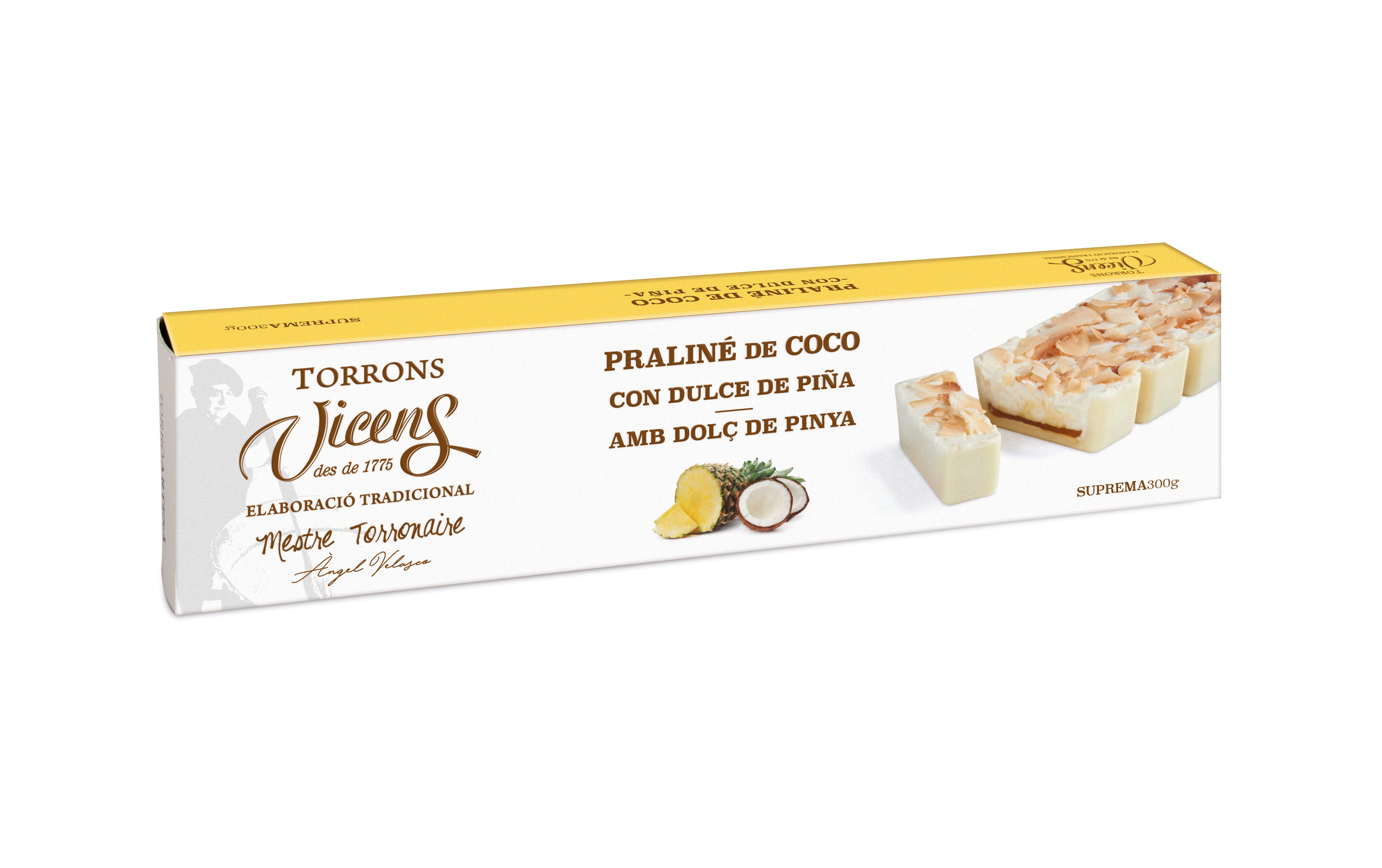 Coconut Praline Nougat with Pineapple by Vicens – 300g Bar – White Chocolate Turrón with Coconut Pieces and Tropical Notes