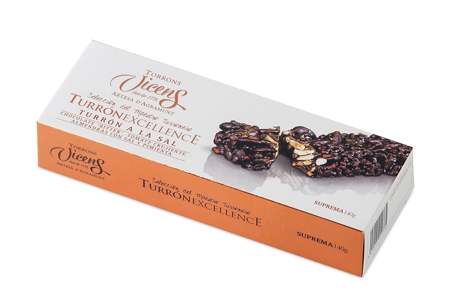 - Dark Chocolate and Almond Turrón with Sea Salt by Vicens (140 g): Indulge in this rich dark chocolate turrón, enhanced by the crunch of almonds and a touch of sea salt for a perfect balance of flavors.
