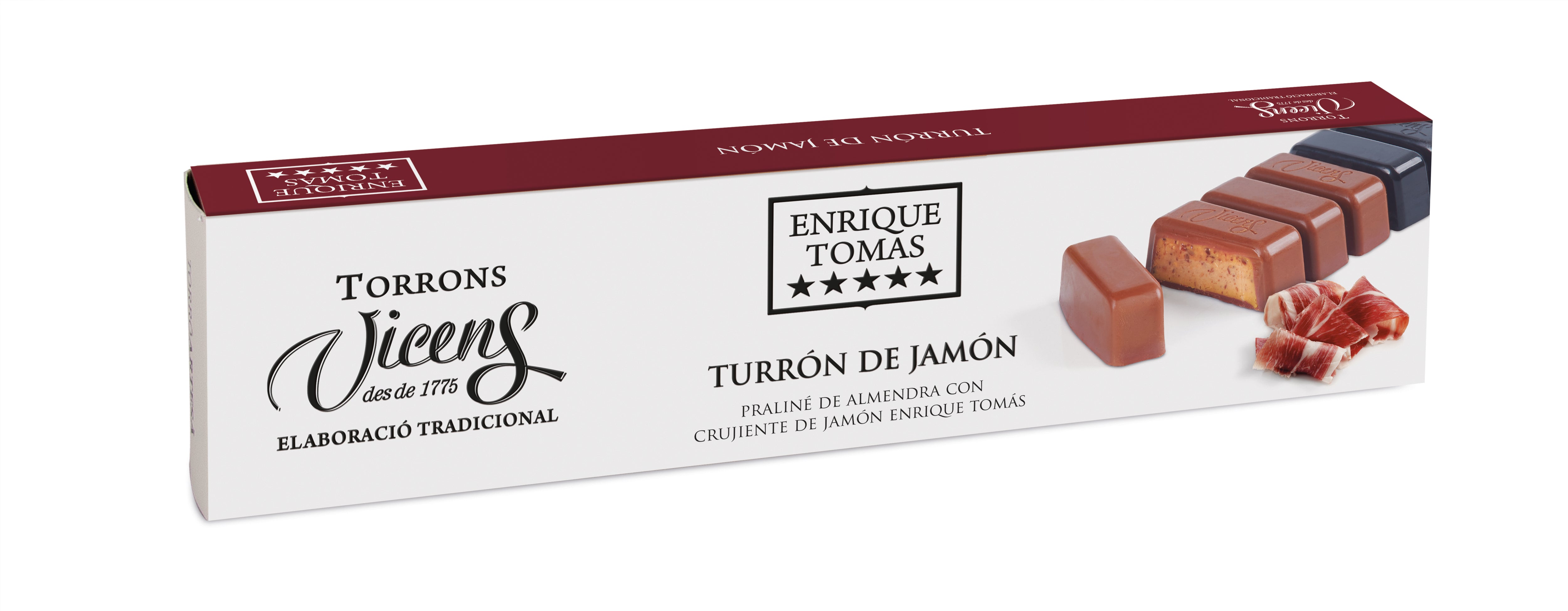 • Collaboration Between Vicens & Enrique Tomás – Crafted by Vicens using ham from Enrique Tomás, known for its high quality. This partnership results in a turrón that showcases creativity, tradition, and gastronomic craftsmanship.