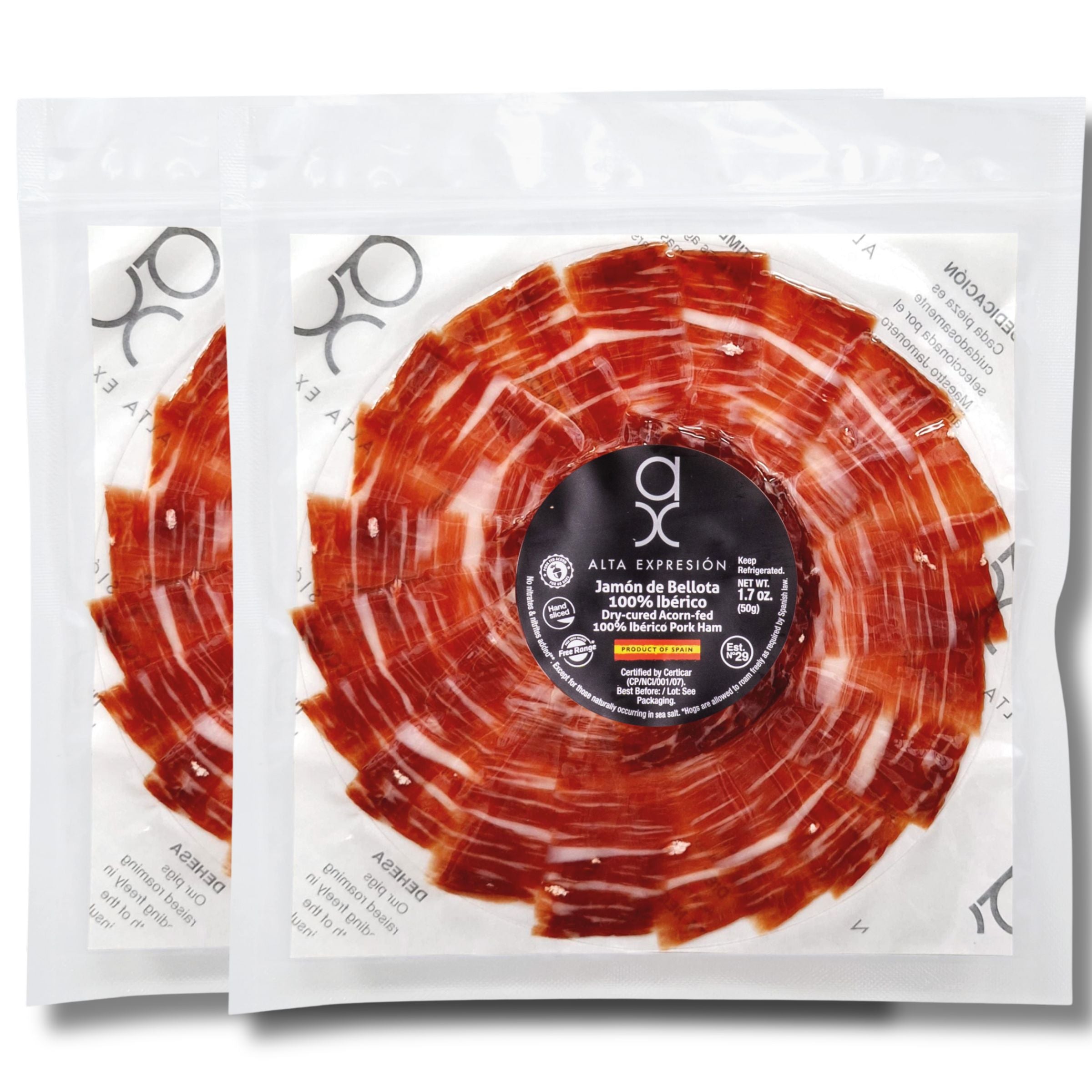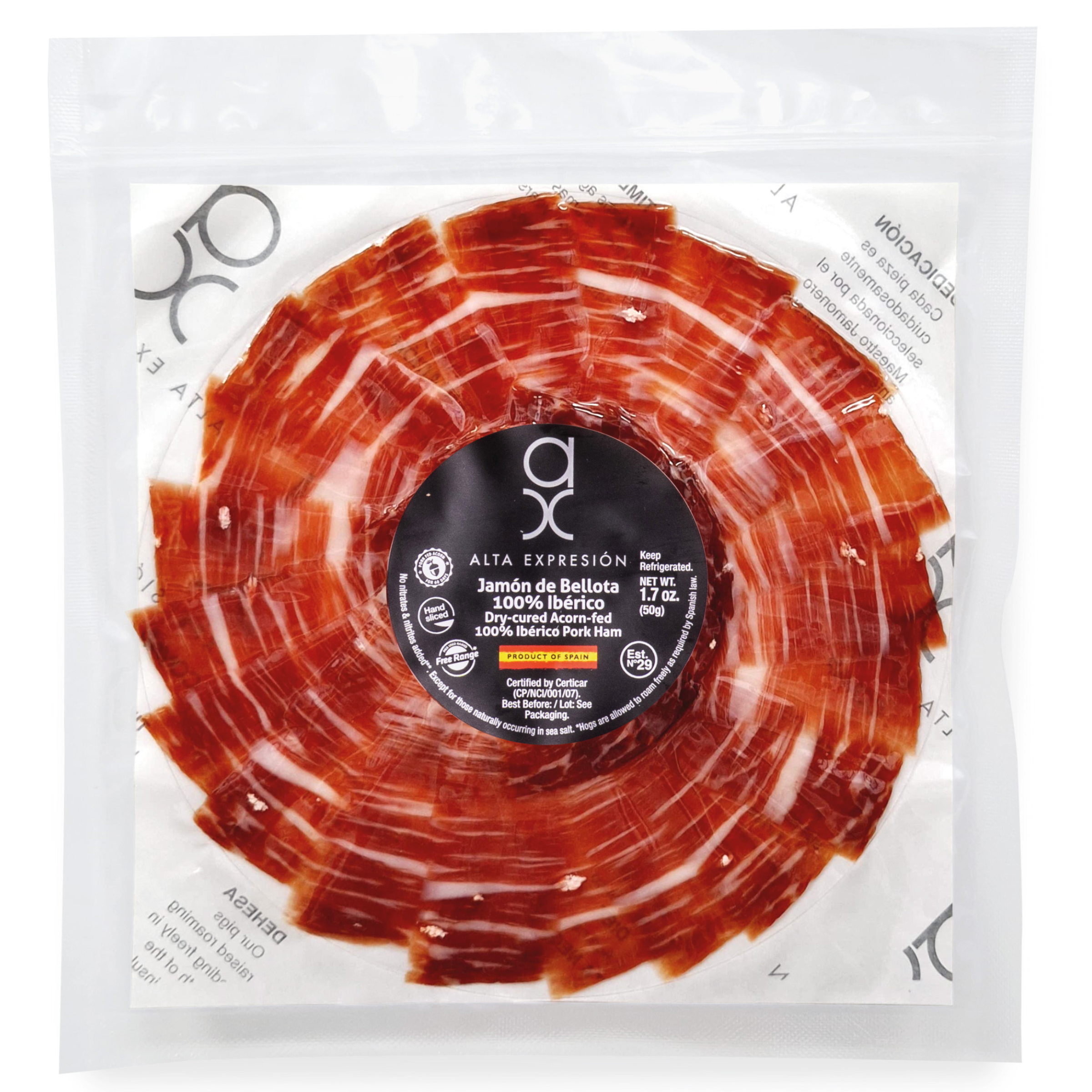 Acorn-Fed 100% Ibérico Ham (Jamón de Bellota) – Hand-Carved Pre-Sliced Round Plate 1.7 oz – Dry-Cured, Sea Salt Only – Product of Spain - Alta Expression by Covap
