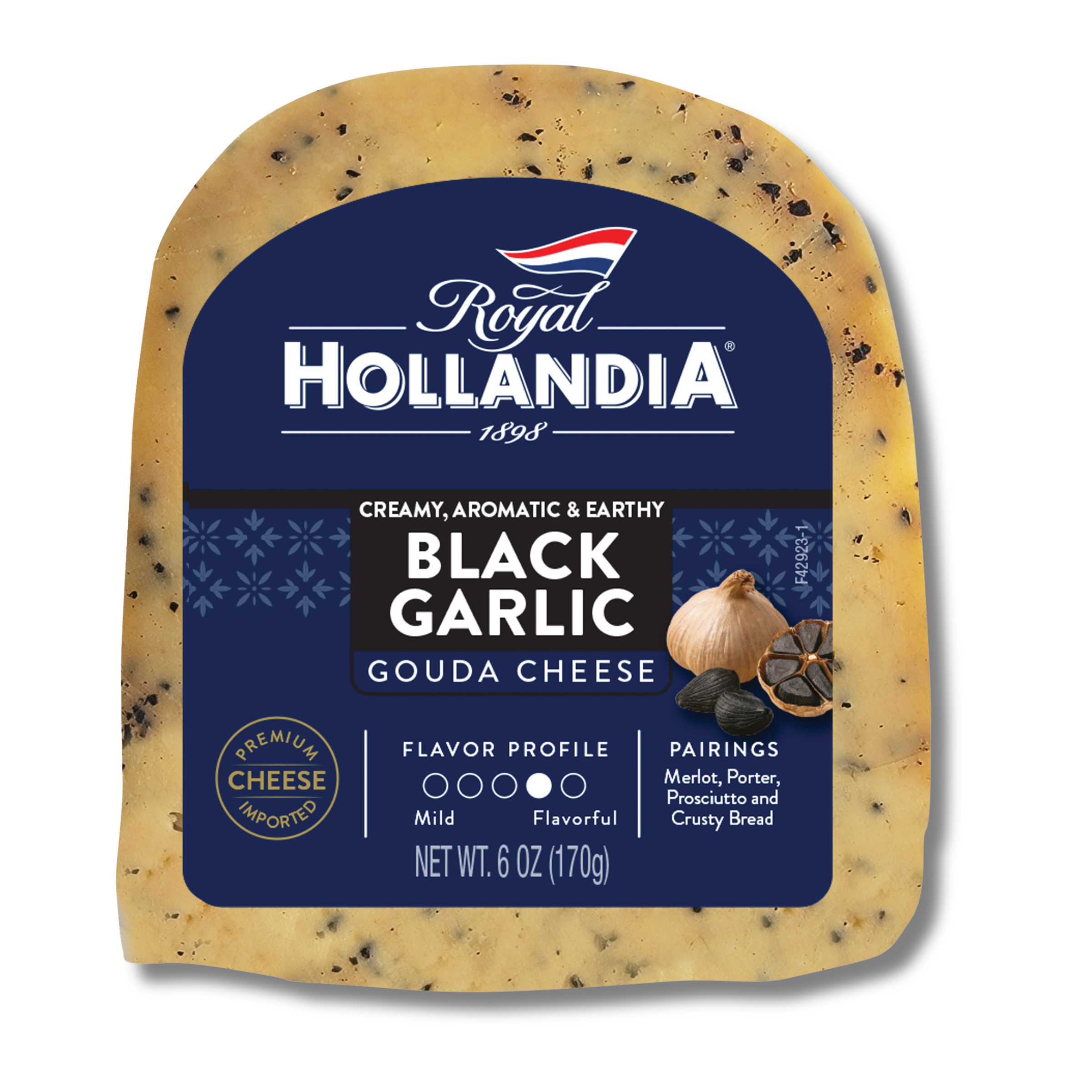 • Black Garlic Gouda (6 oz) – Aged Gouda infused with sweet and earthy black garlic, offering a bold and distinctive flavor.