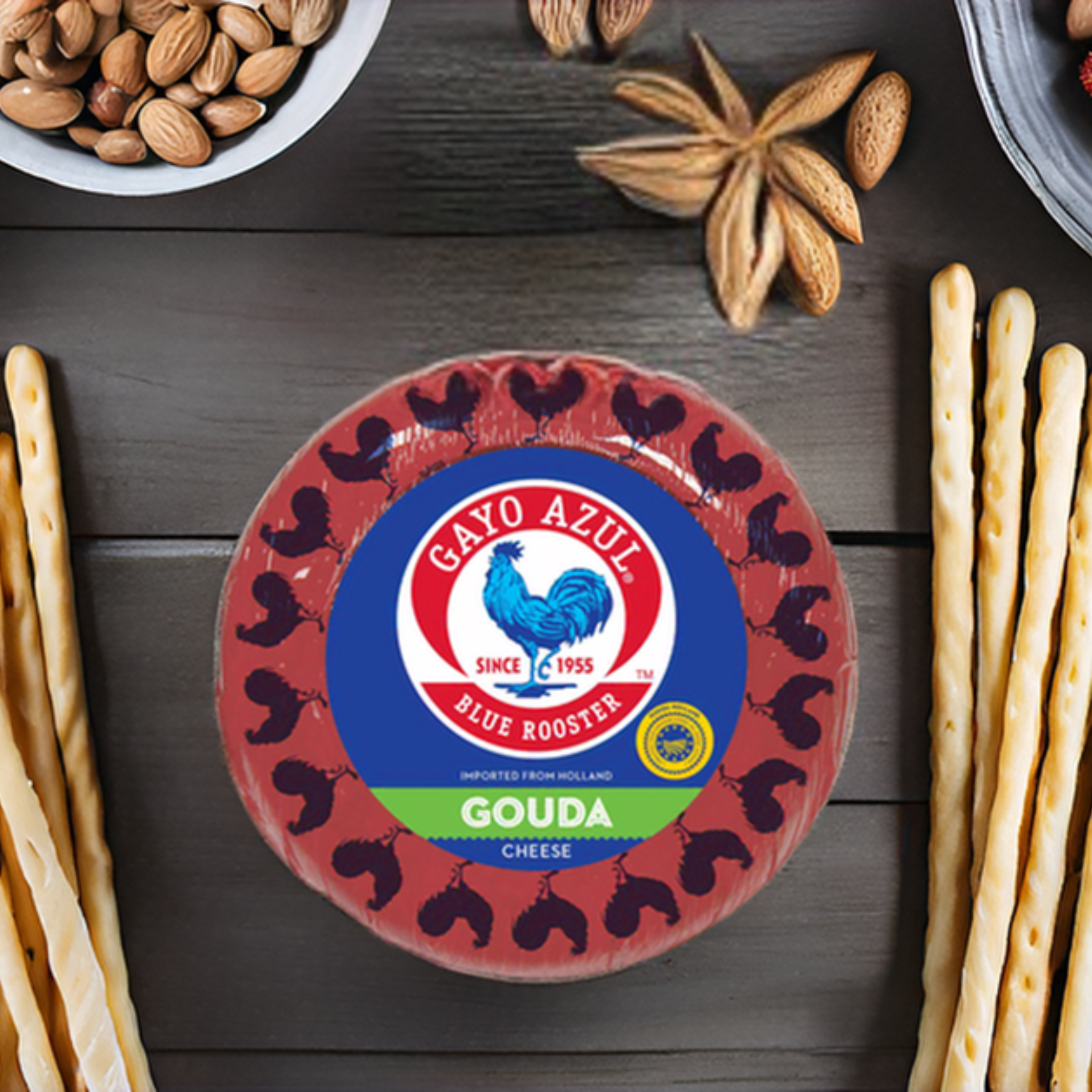 Bring tradition and flavor to your table with the Gayo Azul Blue Rooster Red Wax Mild Gouda, a 10lb wheel of premium Dutch-style cheese. Encased in its signature red wax, this mild Gouda boasts a creamy texture and balanced flavor, making it a favorite for both casual snacking and culinary creations.